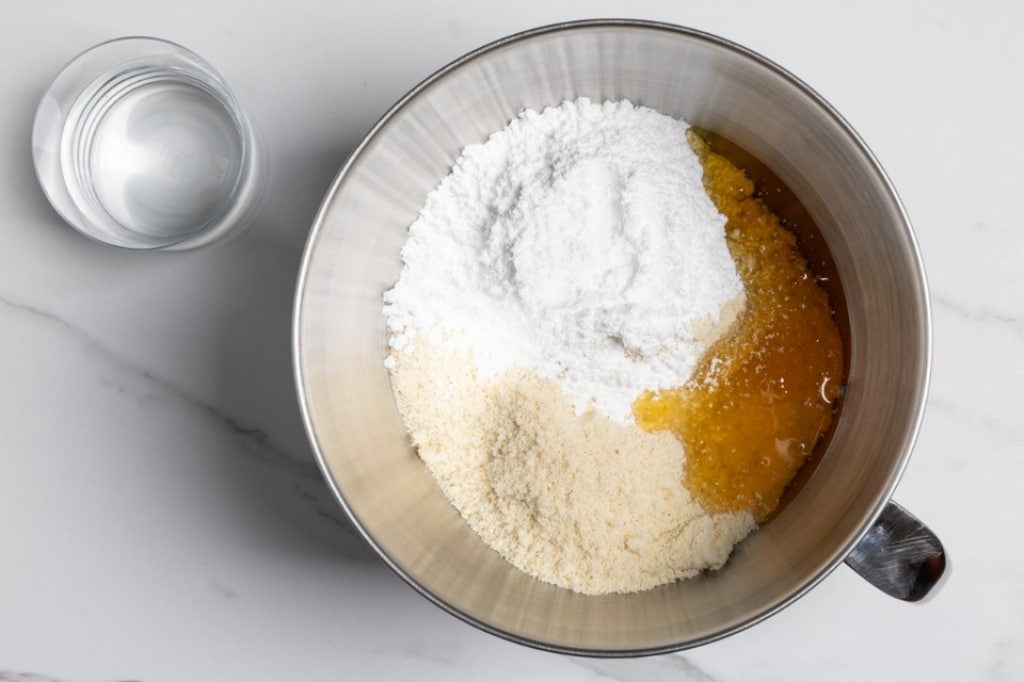 Per preparare l’agnello pasquale per prima cosa dedicatevi alla pasta di mandorle. Unite nella ciotola della planetaria la farina di mandorle con lo zucchero a velo e il miele e lavorate fino a ottenere un composto omogeneo. Aggiungete l’acqua poca alla volta dosandola in modo da rendere compatta la pasta. Se dovesse risultare troppo morbida, potete aggiungere dello zucchero a velo. Trasferite su una spianatoia e impastate aiutandovi con dello zucchero a velo, fino a ottenere un impasto liscio e omogeneo.