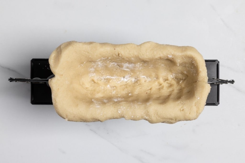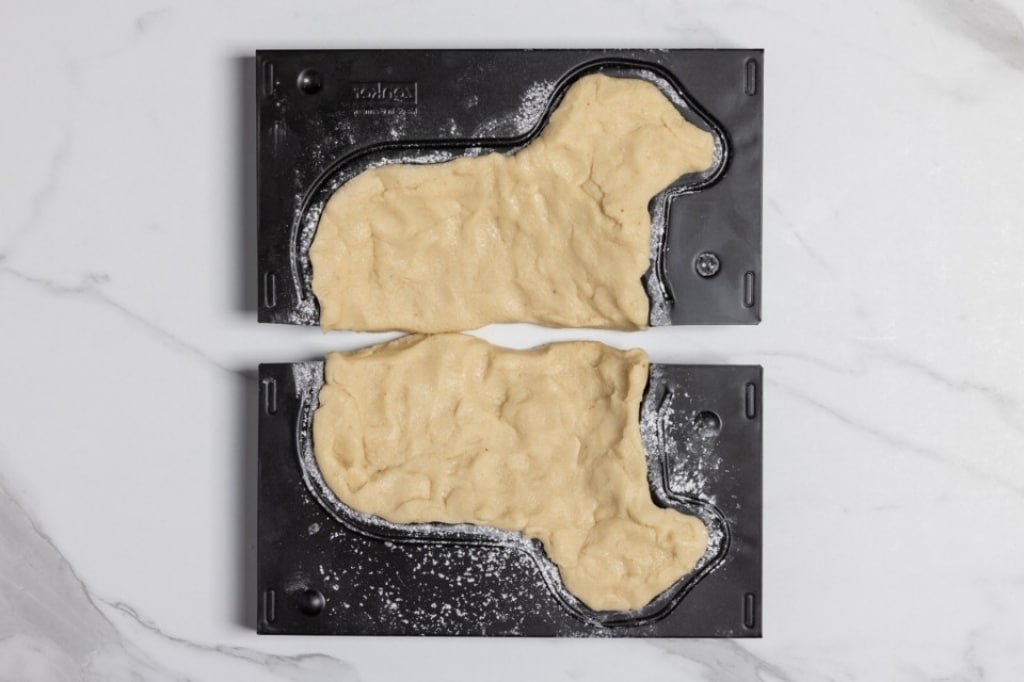 Distribuite la pasta di mandorle aiutandovi con le dita, dovrete riempire le due metà fino ai bordi, poi richiudete. Schiacciate l’impasto verso le pareti dello stampo in modo da creare una cavità centrale. Mantenete un po' di pasta di mandorle in eccesso in modo che sbordi dallo stampo, servirà poi per chiudere la base dell'agnello.