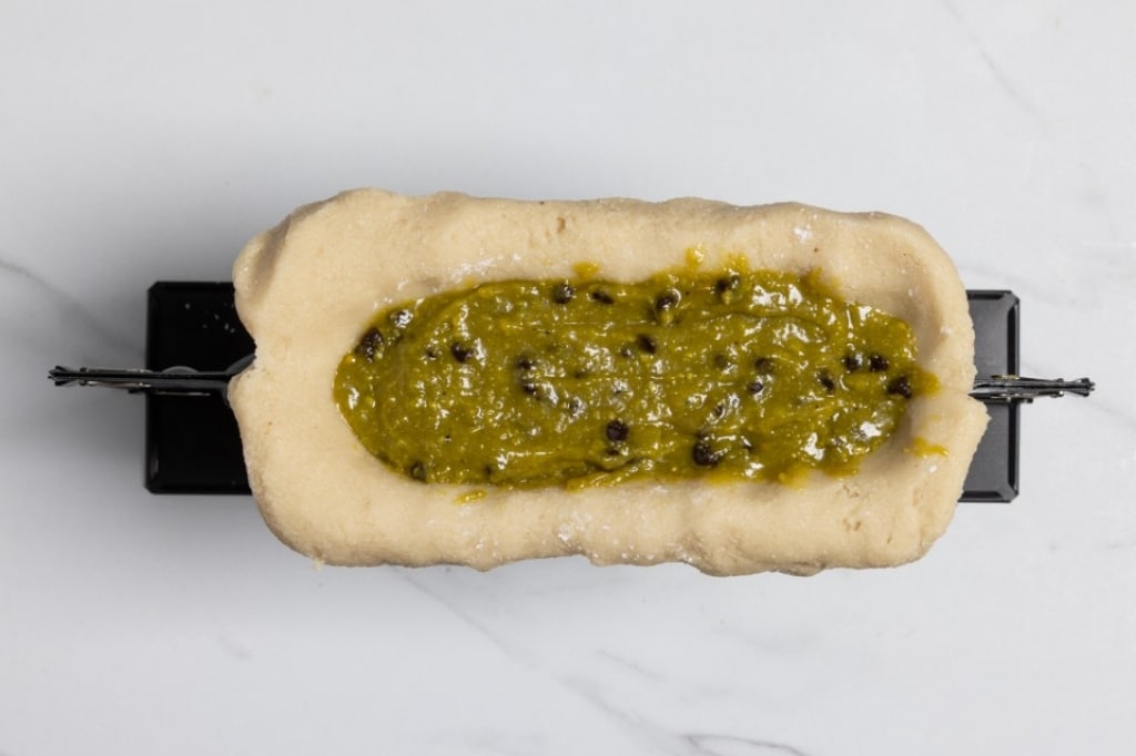 Preparate ora la pasta di pistacchio. Unite nel mixer la farina di pistacchio e la farina di mandorle, lo zucchero a velo, il glucosio, l’acqua e il sale e frullate fino a ottenere un composto omogeneo. Trasferitelo in una ciotola, aggiungete le gocce di cioccolato e la marmellata di pere e amalgamate.