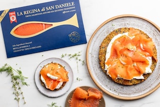 In particolare, la Regina di San Daniele è un filetto di trota salmonata, caratterizzata dalle tipiche carni magre e compatte, affumicata a freddo con metodo artigianale, cioè usando esclusivamente legna, bacche ed erbe aromatiche. È declinata in diverse varianti: in baffa (il filetto del pesce, per semplicità), intera o preaffettata, rifilata e spinata a mano; a fette lunghe tagliate a mano, forse più pratica da servire; come carpaccio, speziato e anche questo disponibile in trancio intero, preaffettato o a fette; quella che l’azienda chiama Capriccio di Regina, che è la parte centrale del filetto, più tenera e delicata e rifilata a mano; come tartare, fatta a cubetti e ricavata dai filetti più pregiati. E la Regina Affinata agli Agrumi, che ha vinto la medaglia d’oro al Merano Wine Festival.