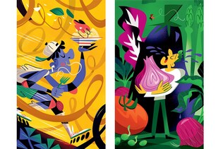 Volevamo un elemento fortemente caratterizzante, oltre a ricette e foto, e abbiamo chiesto a Davide Abbati di continuare un dialogo con il cibo iniziato su cucchiaio.it qualche anno fa. Ecco come sintetizza il suo processo creativo: “Per le illustrazioni di apertura di capitolo abbiamo scelto di mettere al centro il rapporto tra le persone ed il cibo, in ogni immagine infatti un personaggio ci prende per mano e ci invita ad esplorare una scenografia composta da piatti, ingredienti colori e sapori differenti. La grande varietà di ricette presenti nel libro mi ha permesso di riflettere e giocare con le emozioni che la cucina sa muovere: la felicità per una ricetta ben riuscita, la curiosità di chi esplora nuovi sapori, il caos allegro di un piatto preparato velocemente. Ma anche dubbi e incertezze davanti agli scaffali del supermercato o una crisi di pianto davanti ad una cipolla tagliata.