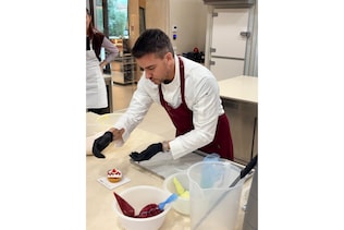 Non si tratta di inserire una salsa alla fine. Il pomodoro entra nella struttura. Viene distribuito, bilanciato, integrato. Sul banco compaiono le altre componenti: un gel di lamponi e ketchup, una chantilly al lampone, una crema pasticcera agli agrumi. Ogni strato ha un ruolo preciso. L’acidità deve trovare una controparte, la dolcezza non può farsi sovrastare, la parte grassa deve accompagnare senza coprire.
