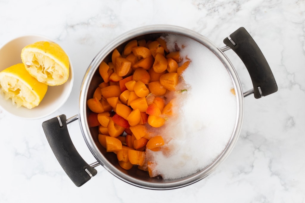 Per preparare la confettura di albicocche cominciante lavando con cura le albicocche, asciugatele, tagliatele a metà e denocciolatele. Riducetele a tocchetti e raccoglietele in una casseruola insieme allo zucchero e al succo di limone. Fate riposare per 3-4 ore.