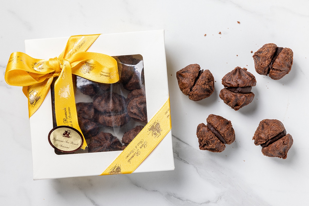 Audaci e dal gusto avvolgente, nocciola e cacao, due gusci morbidi tenuti insieme, al centro, da una crema di cacao cremosa e intensa. Si trovano in tutte le pasticcerie e panetterie della città, di dimensioni diverse, qualcuno li prepara piccoli, scrigni preziosi che si risolvono in un morso, mentre altri ne celebrano l’opulenza, proponendoli in dimensioni generose. Non sappiamo quale sia la differenza tra questi e quelli della vicina Alassio, ma i baci di Sanremo ci ricordano tutti i baci della storia dell’Ariston, dal bianco e nero ad Achille Lauro e Boss Doms.