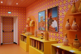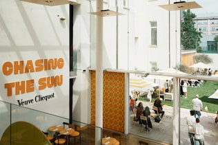 L’allestimento gioca con i colori del sole - giallo e arancione - che richiamano il Giallo Clicquot, tratto distintivo della Maison fin dal XIX secolo. Il risultato è uno spazio pensato per essere attraversato più che osservato, in cui ogni ambiente corrisponde a una funzione diversa.