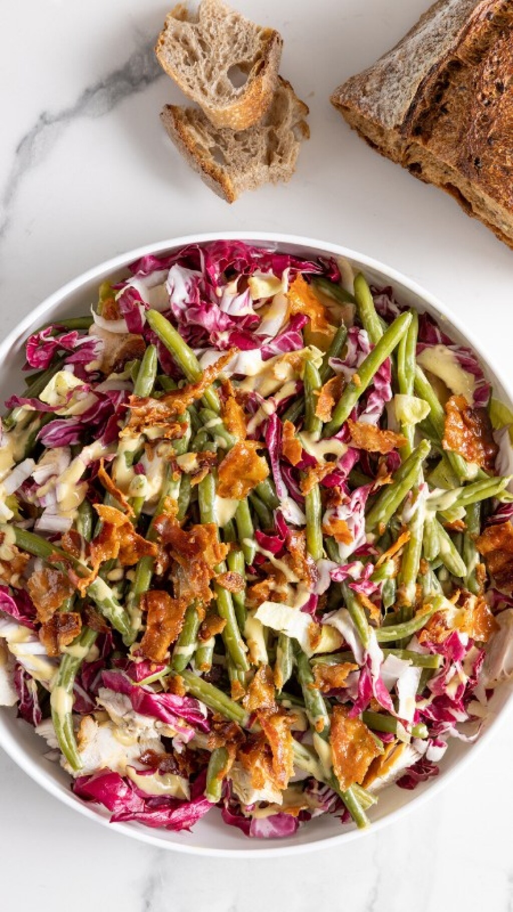 L'insalata di fagiolini, radicchio, indivia e tacchino arrosto è un piatto unico goloso e completo, perfetto per recuperare la carne avanzata da un'altra ricetta in modo appetitoso. Un'insalata ideale per una pausa pranzo oppure per una cena veloce.