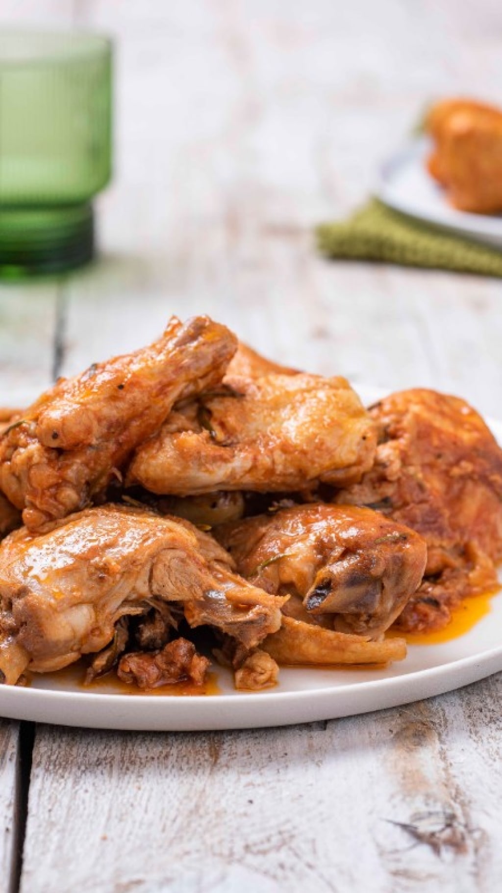 Trasferite il pollo in potacchio sul piatto da portata e servitelo.