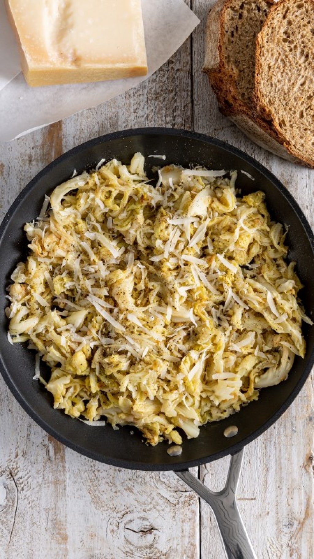 Quando le verze in padella sono leggermente colorite ritiratele dal fuoco, cospargetele con il formaggio grattugiato con una grattugia a fori larghi e servitele.