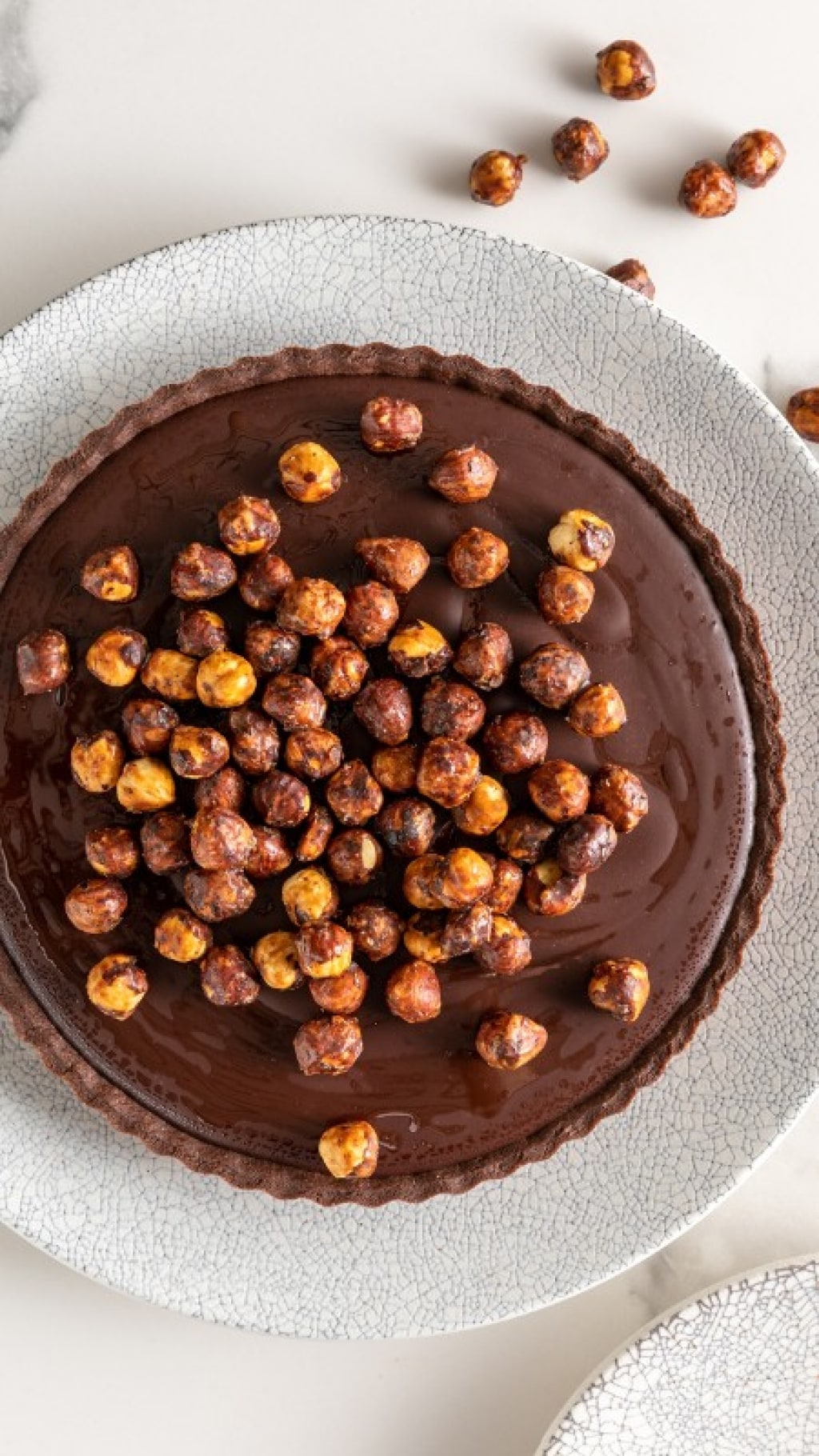 La crostata al cioccolato è una vera tentazione. Un guscio di pasta frolla al cacao raccoglie una ganache morbida e suadente. Una preparazione meno complessa di quanto possa sembrare per un risultato super goloso: la torta è impreziosita da una decorazione di nocciole caramellate che aggiunge un tocco di croccantezza creando un piacevole contrasto con la crema.