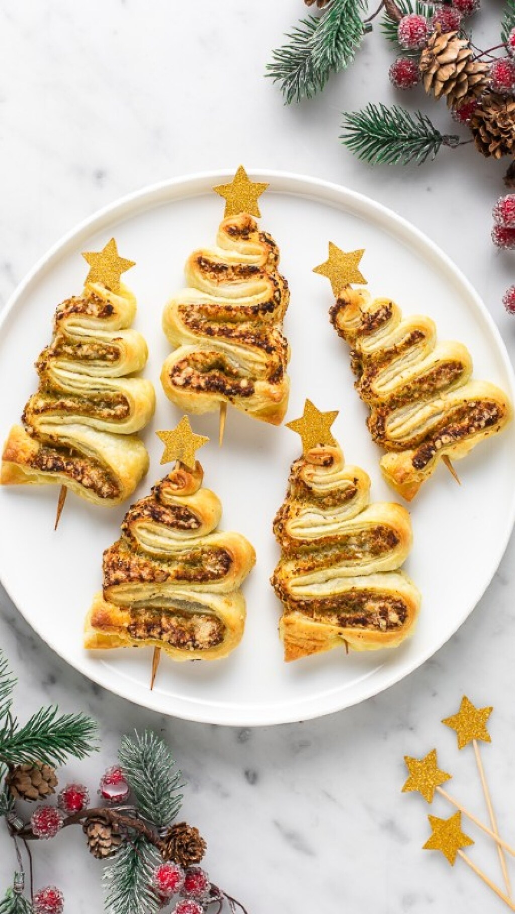 Potete anche prepararli in versione dolce, sostituendo il pesto con una crema al cioccolato o una confettura, per esempio, e avrete dei dolcetti natalizi perfetti per la merenda o per il tè.