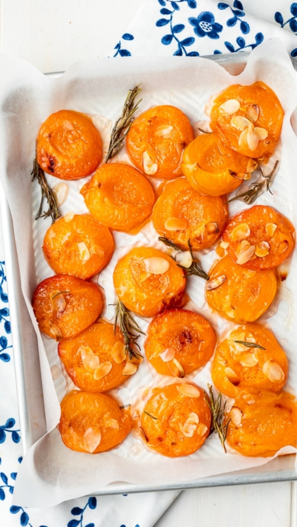 Abbiamo arricchito le albicocche al forno con qualche cucchiaio di miele, da dosare a seconda della dolcezza della frutta che avete a disposizione, rosmarino fresco e mandorle a lamelle per un tocco croccante.