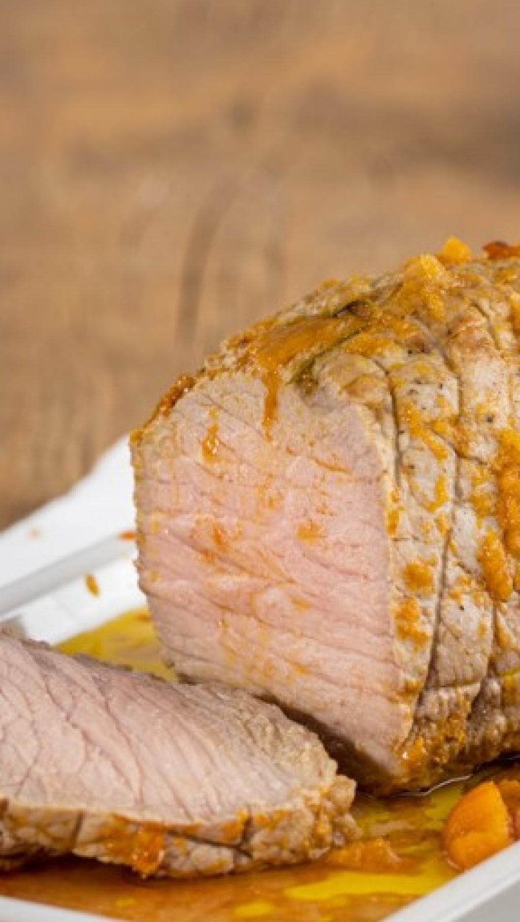 Sfornate l’arrosto e spennellatelo con l’olio agli agrumi. Aggiungete il secondo bicchierino di brandy e infornate nuovamente per 15 minuti. Ritirate l’arrosto quando avrà una temperatura al cuore di 65°C. Servitelo accompagnandolo a piacere con un’insalata di contorno.