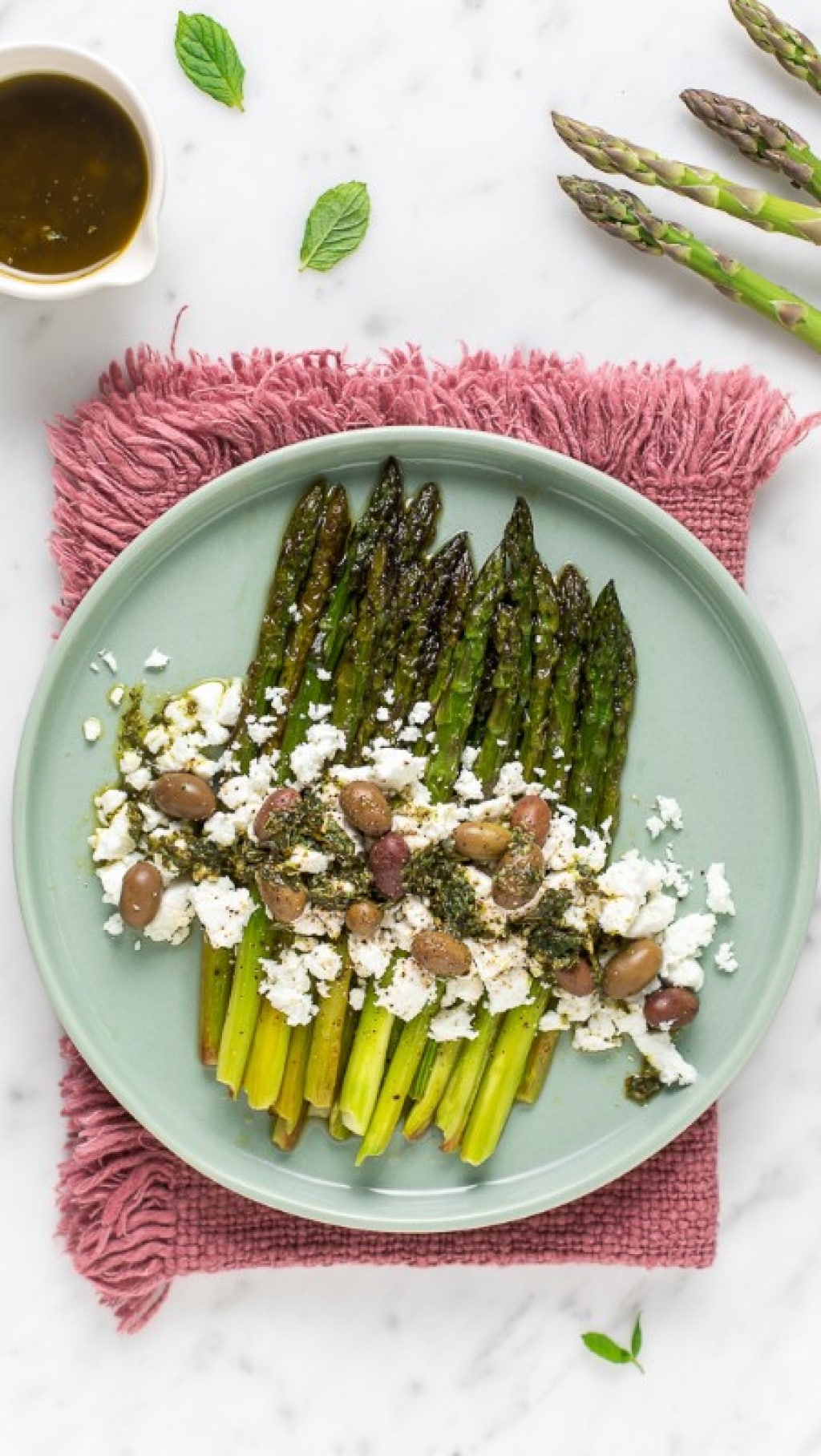 Prepararli è facile e veloce, gli asparagi cotti al vapore si insaporiscono con feta sbriciolata, olive taggiasche e una salsa verde fresca e aromatica, legermente piccante: il chimichurri alla menta. Il risultato è una pietanza dai piacevoli contrasti che può essere servita anche fra i contorni a una grigliata mista di carne o pesce, insieme ad altre verdure.