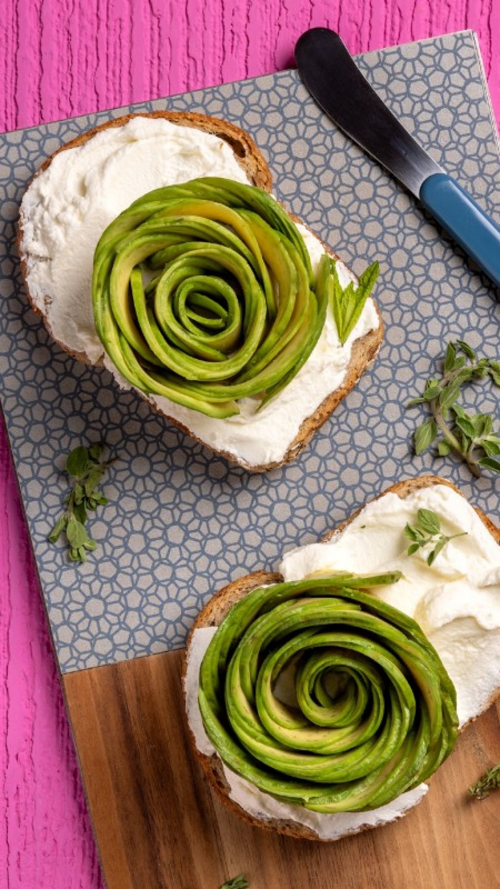 Spalmate con Philadelphia il pane tostato non troppo caldo e posate una rosa di avocado su ogni fetta. Completate l’avocado toast con delle foglioline di erbe aromatiche fresche a piacere come maggiorana, timo, origano o basilico.