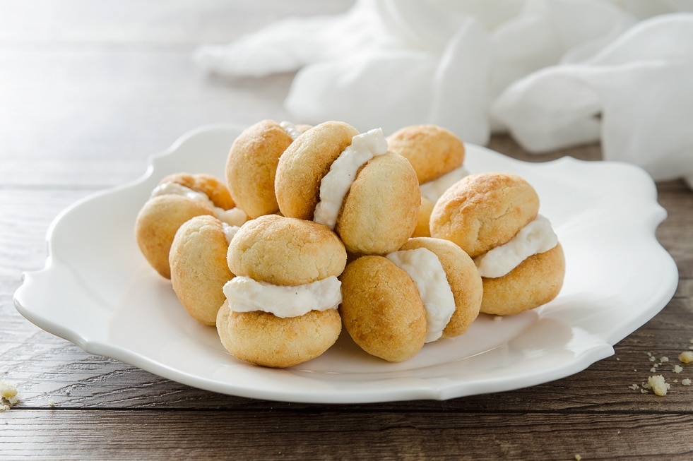 Una volta che i baci di dama si saranno raffreddati completamente, farciteli a due a due con la crema di formaggio e pere.