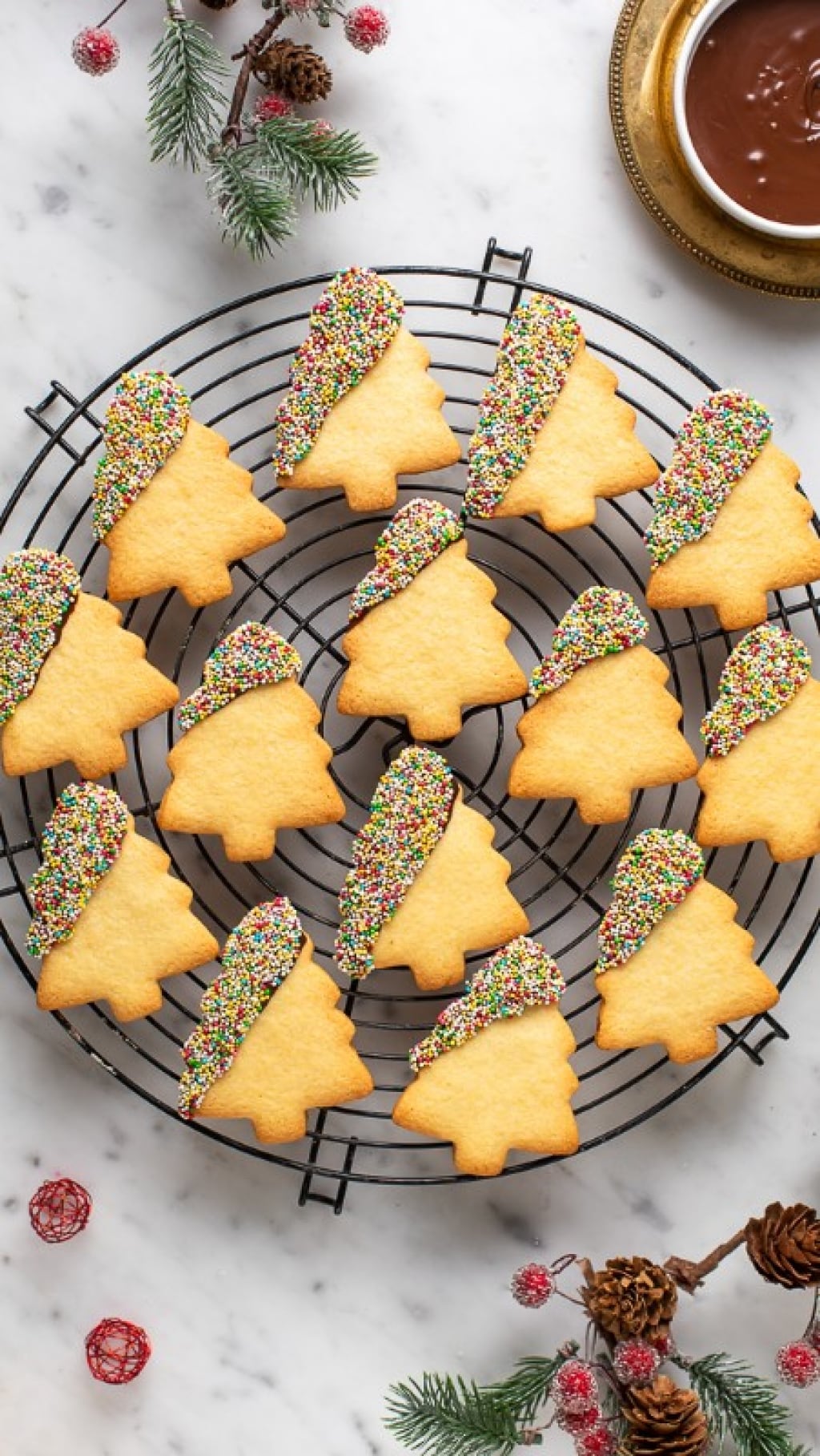 Prepararli è semplice: una volta pronta la pasta frolla va stesa a uno spessore di circa 5 millimetri e poi se ne ricavano i biscotti con un tagliabiscotti a forma di abete. A questo punto si infornano per la cottura. Una volta sfornati e raffreddati, si intingono parzialmente nel cioccolato fondente fuso e poi nella mompariglia.