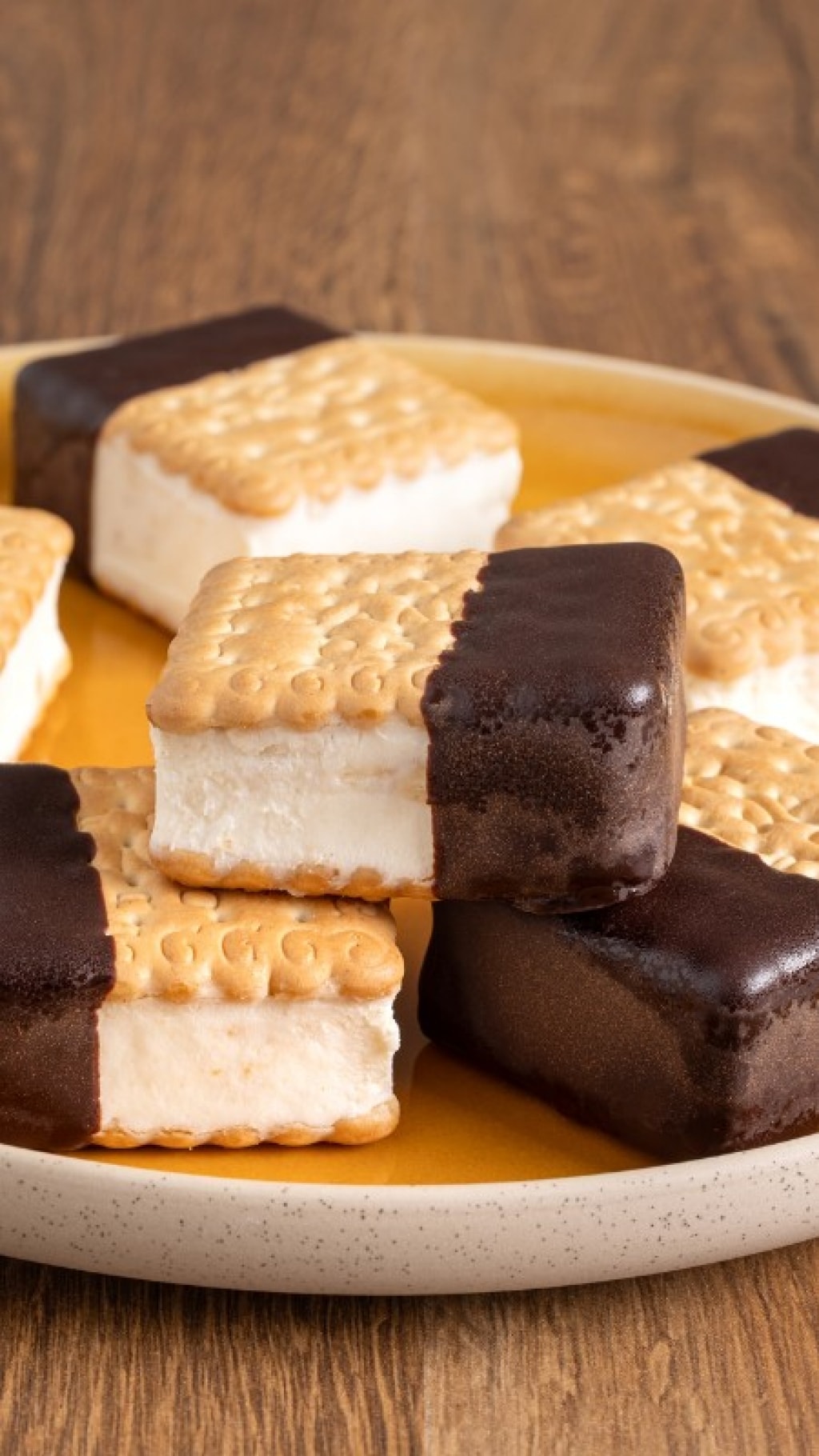 E qui arriva il bello. I biscotti, croccanti, avvolgono uno strato abbondante di gelato alla vaniglia, cremoso e fresco. Il tocco speciale? La glassa al cioccolato fondente fuso all'esterno: una volta raffreddata, donerà un effetto crunchy golosissimo.