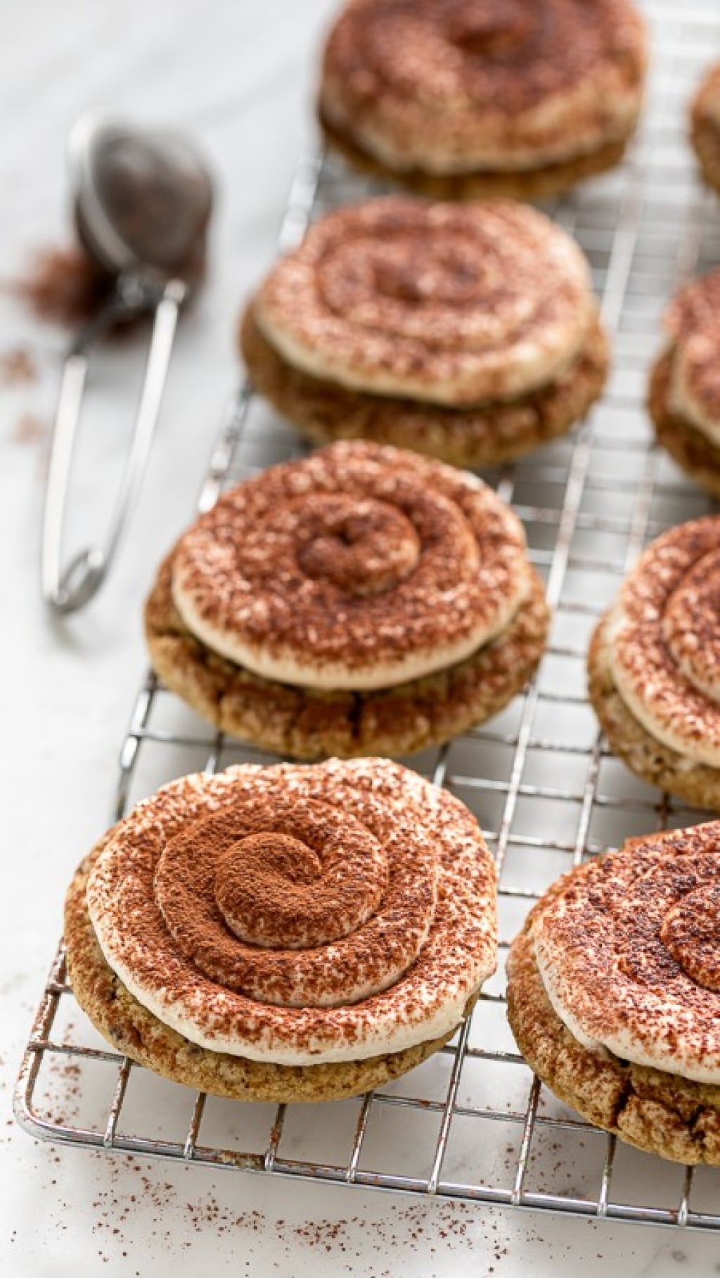 Cuocete i biscotti, una teglia alla volta, nel forno preriscaldato a 180°C per 12-14 minuti. Sfornateli e non toccateli fino a quando saranno giunti a temperatura ambiente, quindi trasferiteli su una gratella per dolci e lasciateli raffreddare completamente. Decorateli con un vortice di crema al mascarpone.