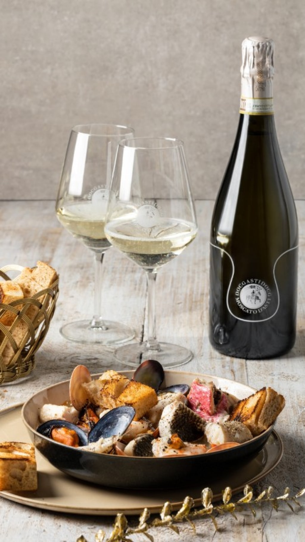 Proponiamo in abbinamento un Asti Moscato Spumante Brut o Extra Dry dagli aromi suadenti e armoniosi, il corpo moderato di questo vino accompagna il piatto alla perfezione.