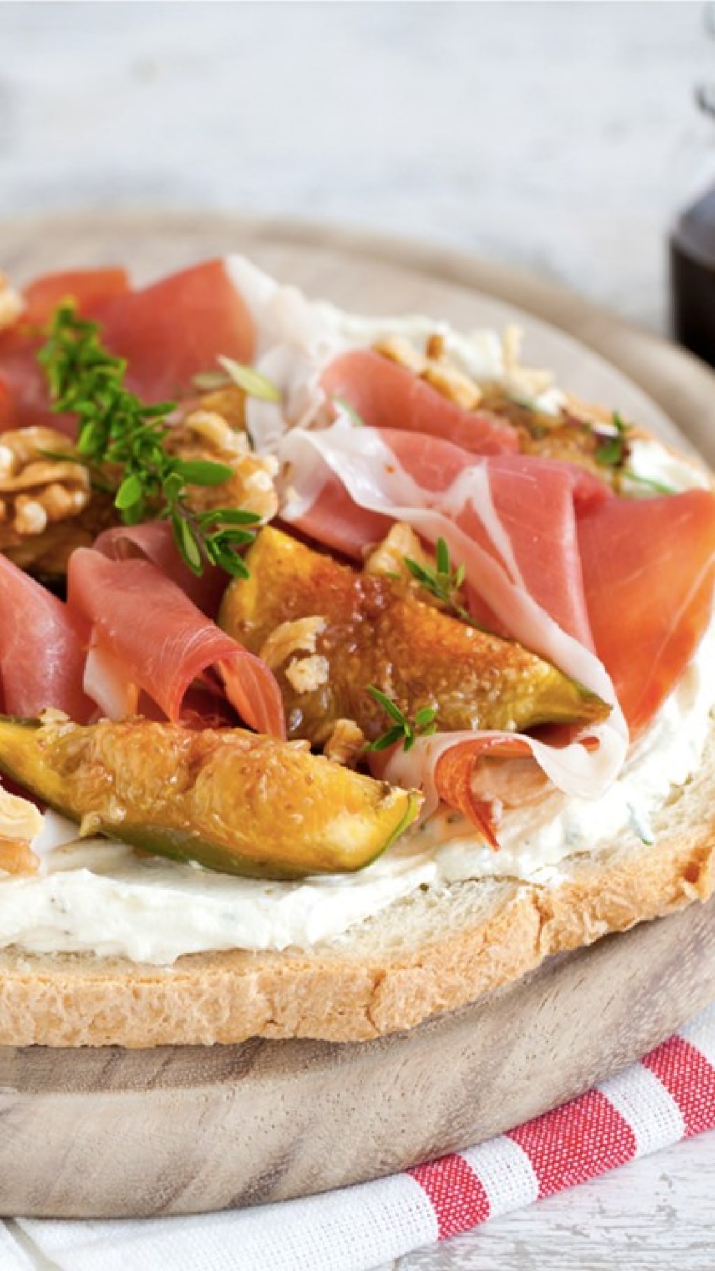 In una ciotolina condite la robiola con olio, pepe fresco di mulinello e 1 rametto di rosmarino tritato. Spalmate la crema ottenuta sul pane, adagiatevi le fette di prosciutto e i fichi al balsamico.