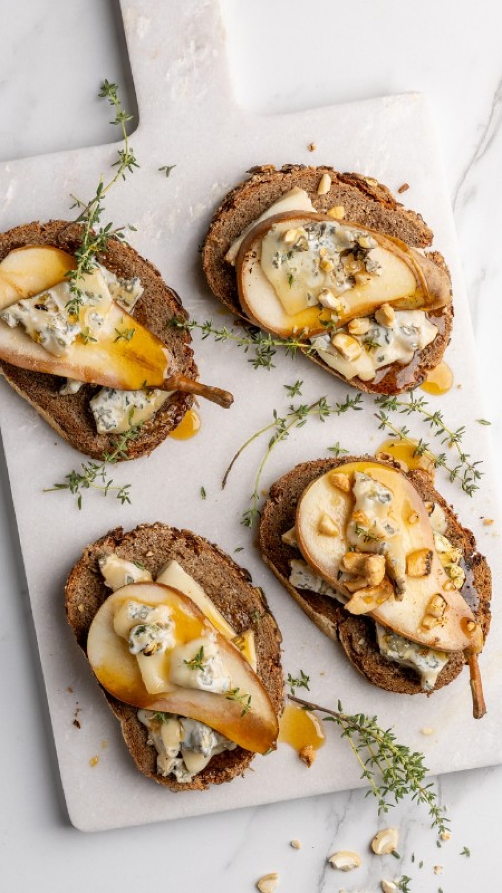 Le bruschette autunnali con le pere sono l'idea perfetta, facile e rapida da realizzare, per un aperitivo in compagnia. Preparate con pane nero tostato e caratterizzate da sapore dolce-sapido, ben equilibrato, si abbinano con gusto al vostro calice di rosso o bianco preferito.