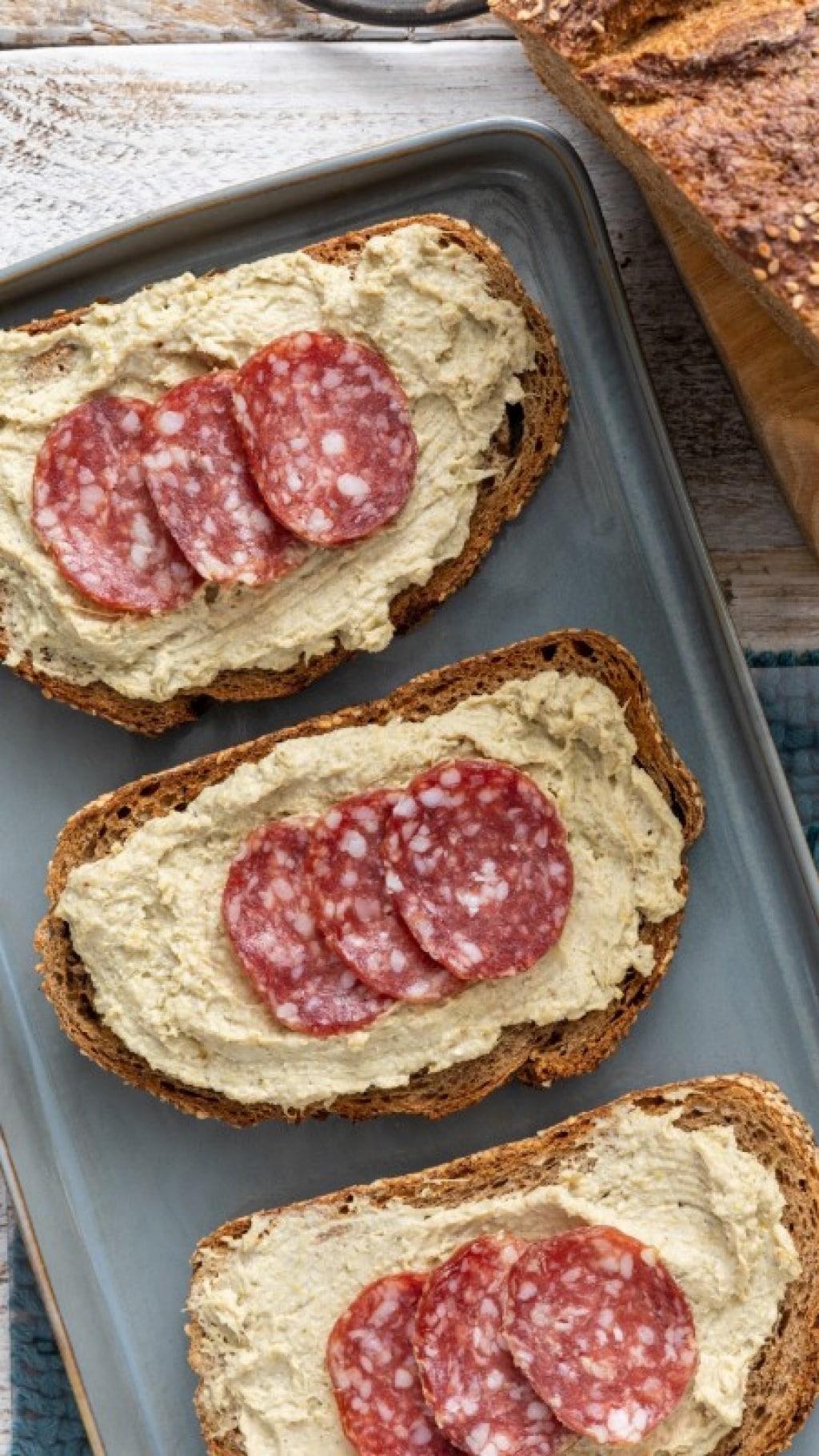 Servite le vostre bruschette con crema di carciofi e salame.