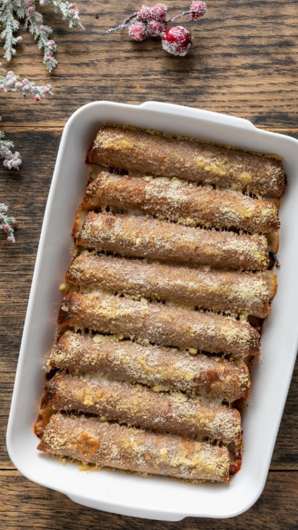 Cuocete in forno statico a 200° per circa 15-20 minuti, fino a doratura. Servite i cannelloni di crêpes alle castagne con radicchio, noci e speck fin tanto che sono caldi.