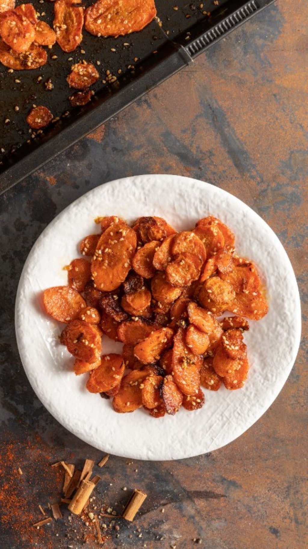 Dopo 20 minuti, a metà cottura, girate le carote in modo che si cuociano uniformemente. Le vostre carote speziate al forno saranno pronte quando risulteranno abbrustolite. Servitele come snack, antipasto o come contorno.
