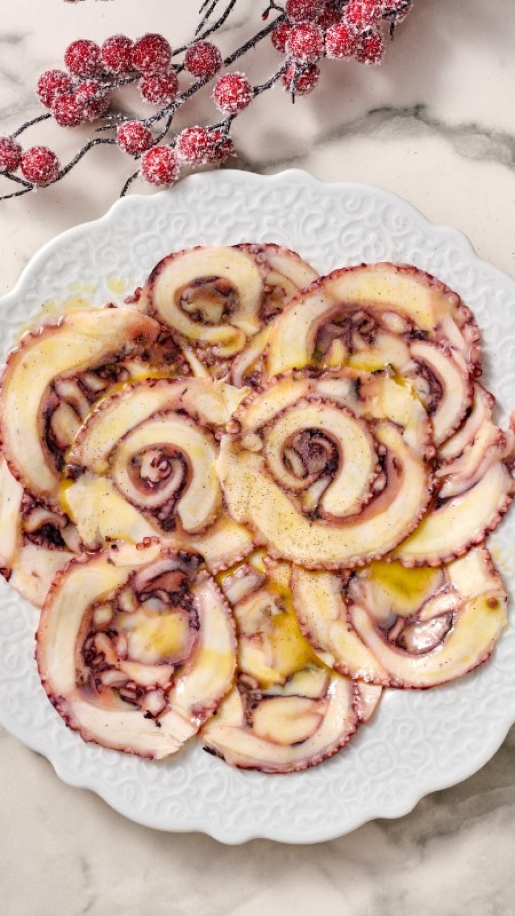 Il riposo è essenziale: prima di affettarlo, il carpaccio di polpo va lasciato in frigorifero per 12 o, meglio ancora, 24 ore. Solo allora sarà pronto per essere tagliato sottilmente e servito con una profumata citronette, che potete preparare seguendo la nostra ricetta.