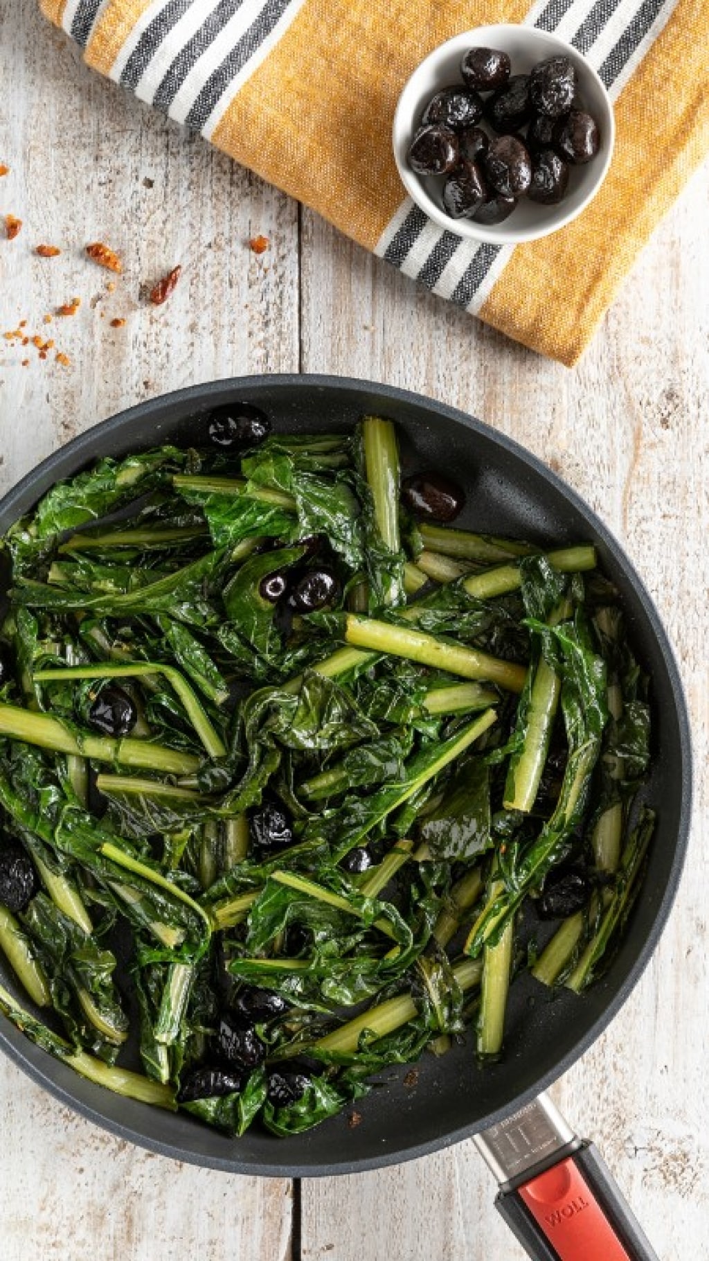 La catalogna in padella è un contorno semplice e gustoso, ottimo accompagnamento per vari secondi piatti. Così preparata, appena cotta a vapore e poi saltata in padella con aglio, peperoncino e carnose olive nere può essere impiegata anche per farcire una focaccia, come una schiacciata alla cicoria (in questo caso scegliete olive denocciolate).