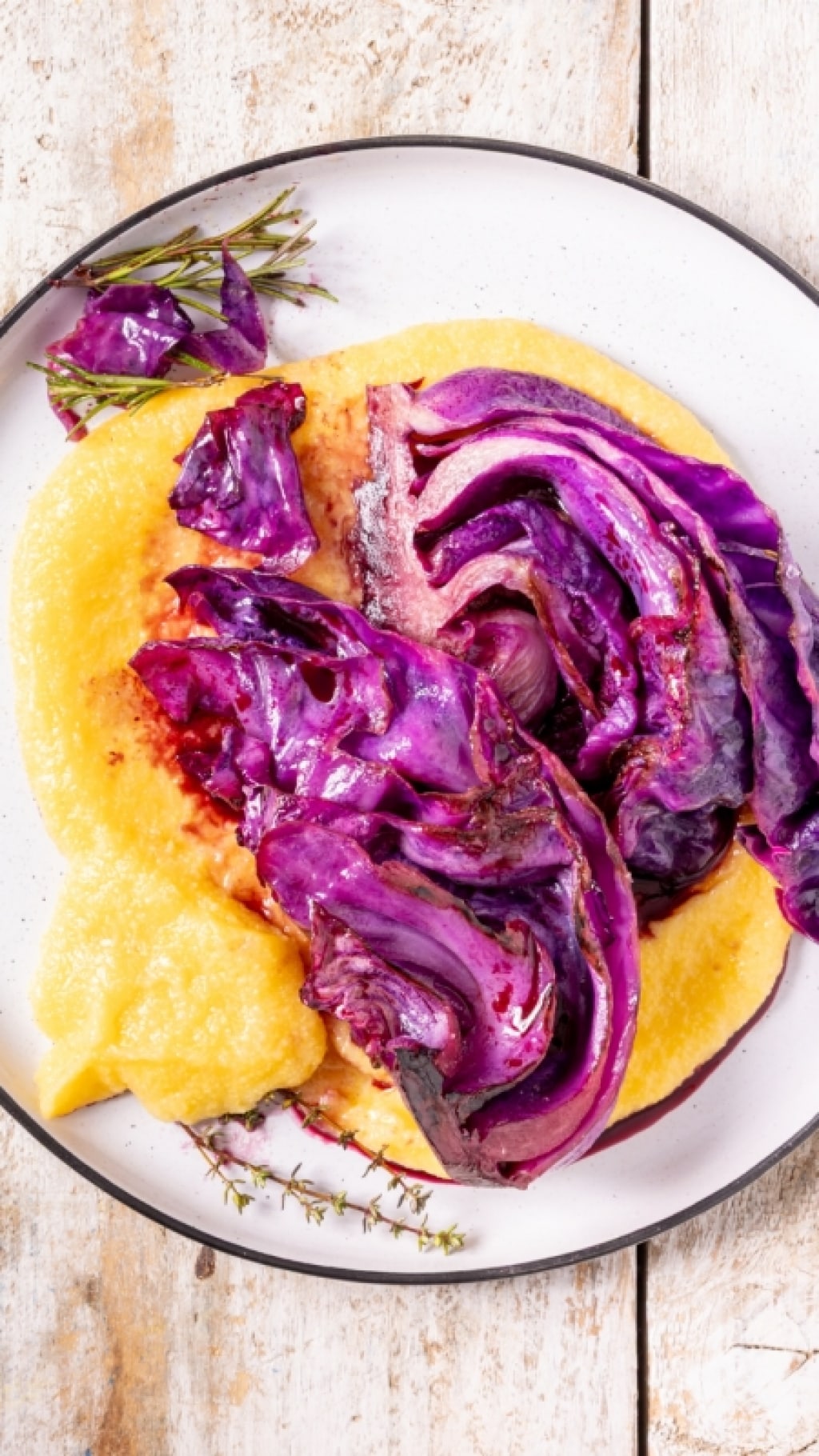 A questo punto aggiungete il vino rosso, dopo pochi minuti girate le fette di cavolo e unite timo, rosmarino e alloro. Abbassate il fuoco e portare a cottura, ci vorranno circa 10-15 minuti. Lasciate asciugare gradualmente i liquidi finché la superficie del cavolo si caramella e si fa lucida, poi regolate di sale e pepe.