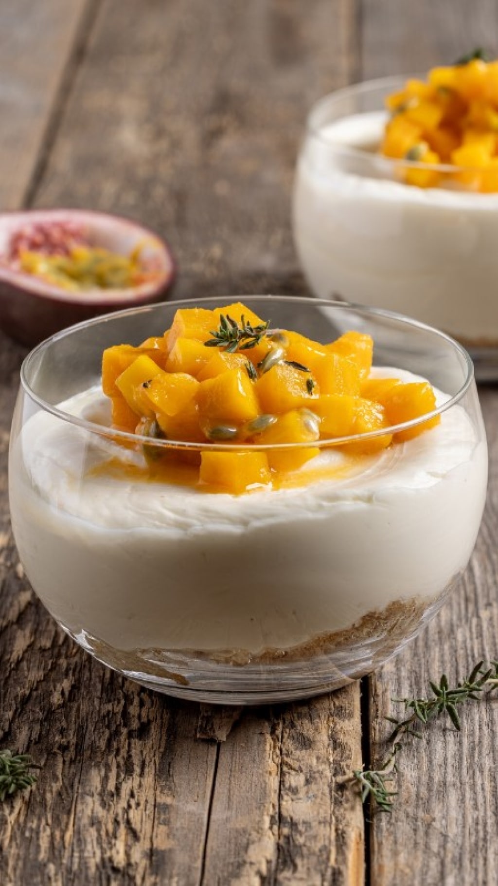 Pulite e tagliate a piccoli cubetti il mango, amalgamatelo in una ciotola con la polpa di passion fruit e utilizzatelo per decorare le cheesecake al bicchiere. Ultimate la decorazione con qualche fogliolina di timo fresco e gustate la vostra cheesecake al cucchiaio.