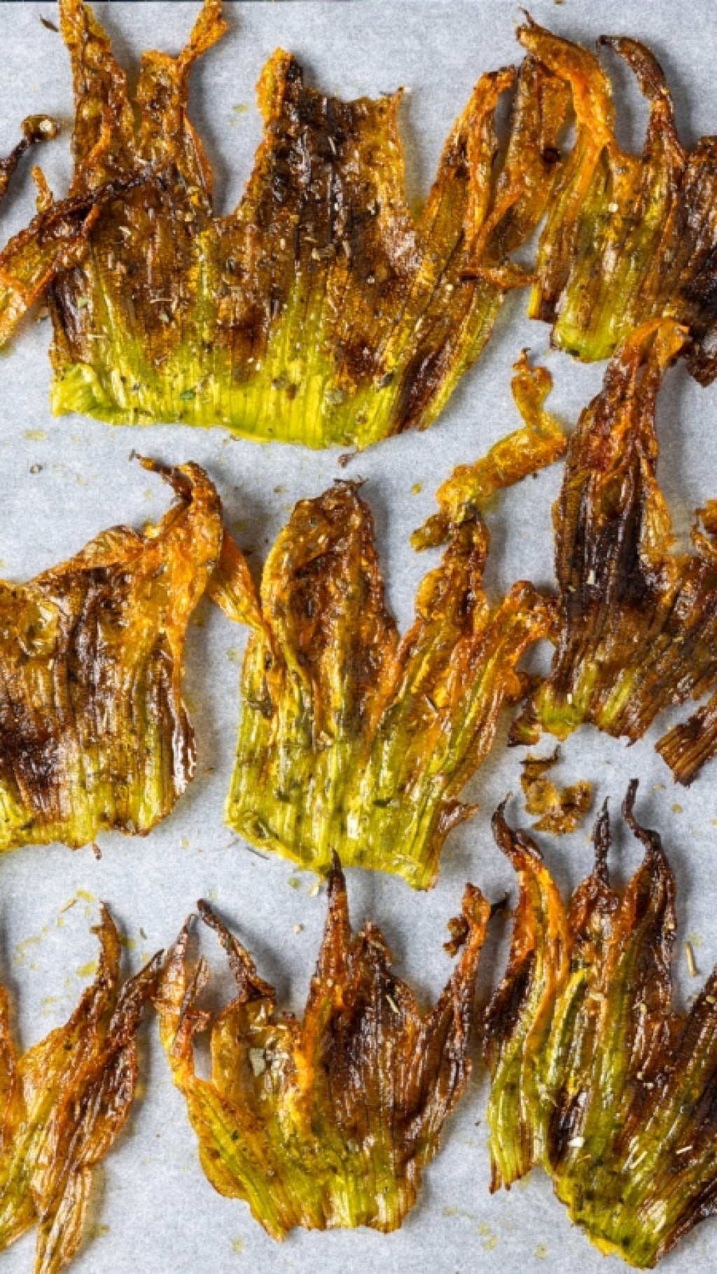 Prestate attenzione alla cottura in forno, le chips di fiori di zucchina diventano dorate in pochi minuti e sono subito pronte per essere sgranocchiate!
