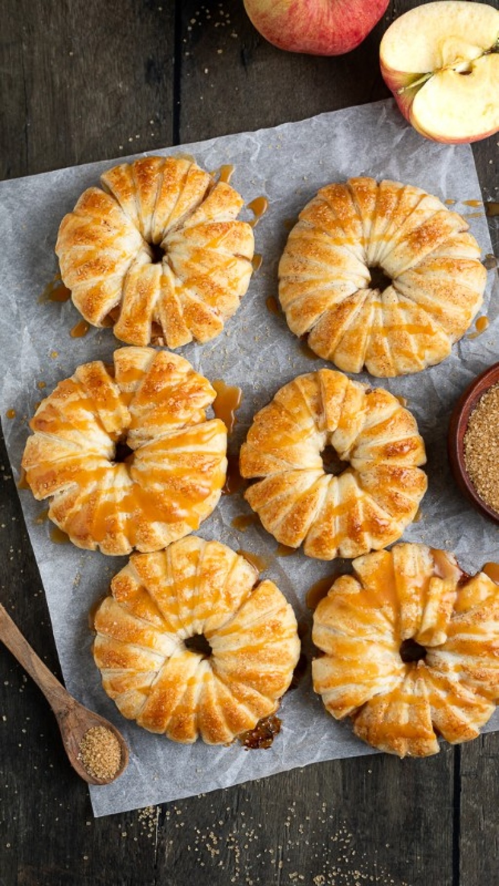 Le ciambelle di mela e pasta sfoglia sono dolcetti semplici e ghiotti, buoni a colazione come a merenda. Servite con una colata di caramello salato, queste ciambelline sfogliate alla mela sono ideali anche per un festoso brunch della domenica o come vero e proprio dessert.