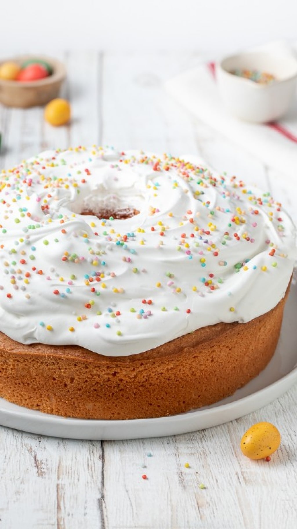Aggiungete prima lo zucchero semolato a pioggia e, dopo 2 minuti, quello a velo. Continuate a montare fino a ottenere una meringa lucida e densa che non scendera più a filo. Distribuitela con un cucchiaio sulla superficie del dolce ancora all'interno dello stampo e cospargete con i diavoletti colorati. Infornate a 90°C per 35-40 minuti fino a quando la meringa si sarà indurita.
