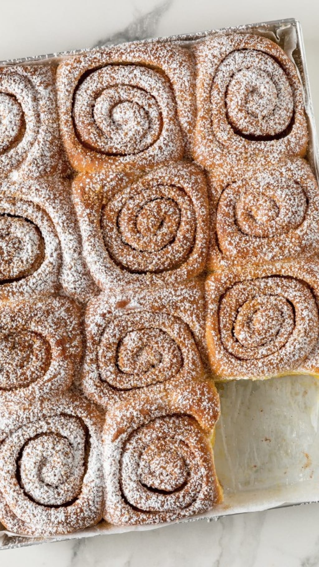 Togliete dal forno, lasciate intiepidire: basta una spolverata di zucchero a velo e i cinnamon rolls sono pronti per essere serviti e gustati!