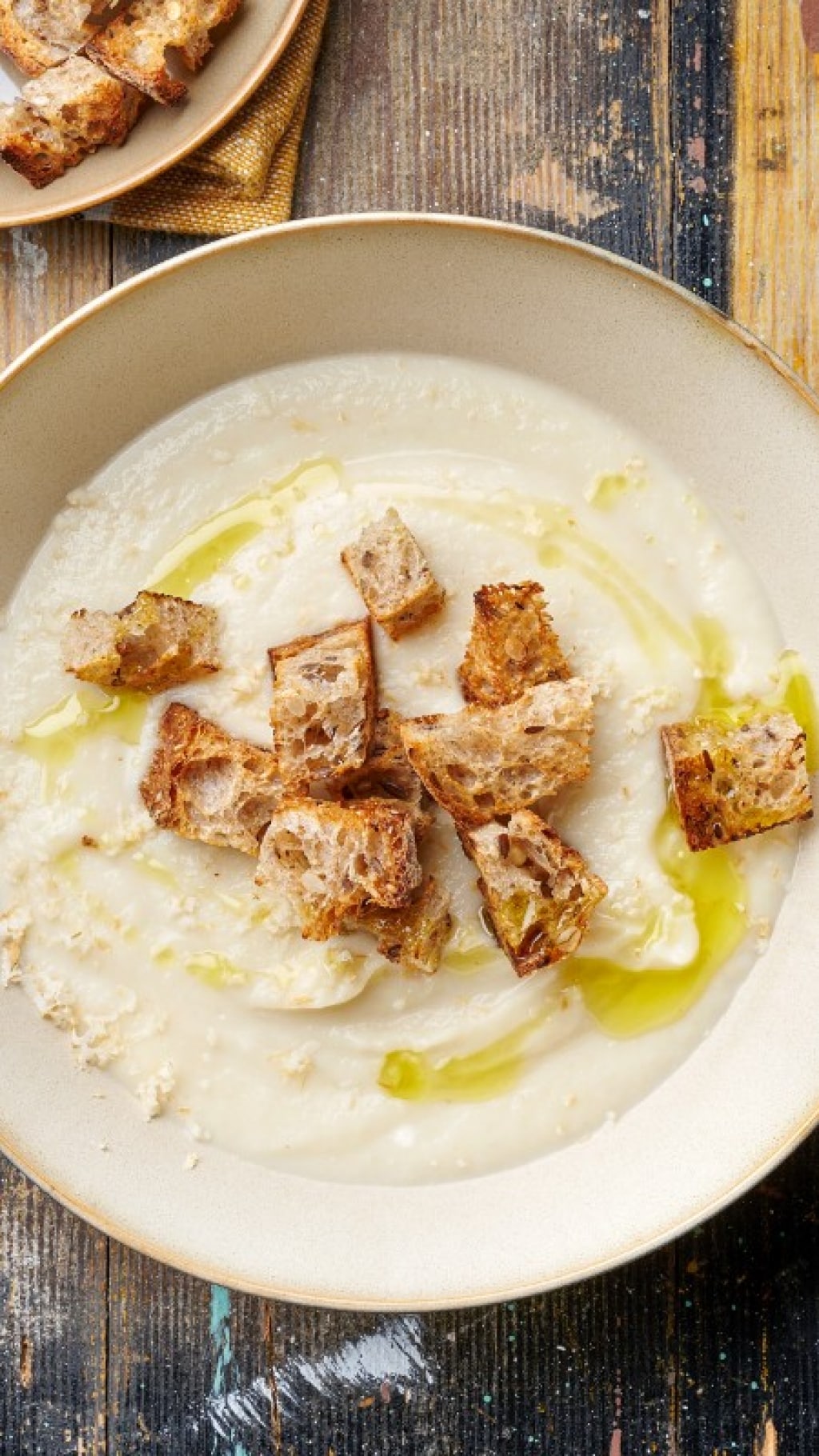 La crema di sedano rapa è pronta. Servitela nei singoli piatti e completate con un giro di olio extravergine d'oliva, rafano grattugiato e crostini di pane a piacere.
