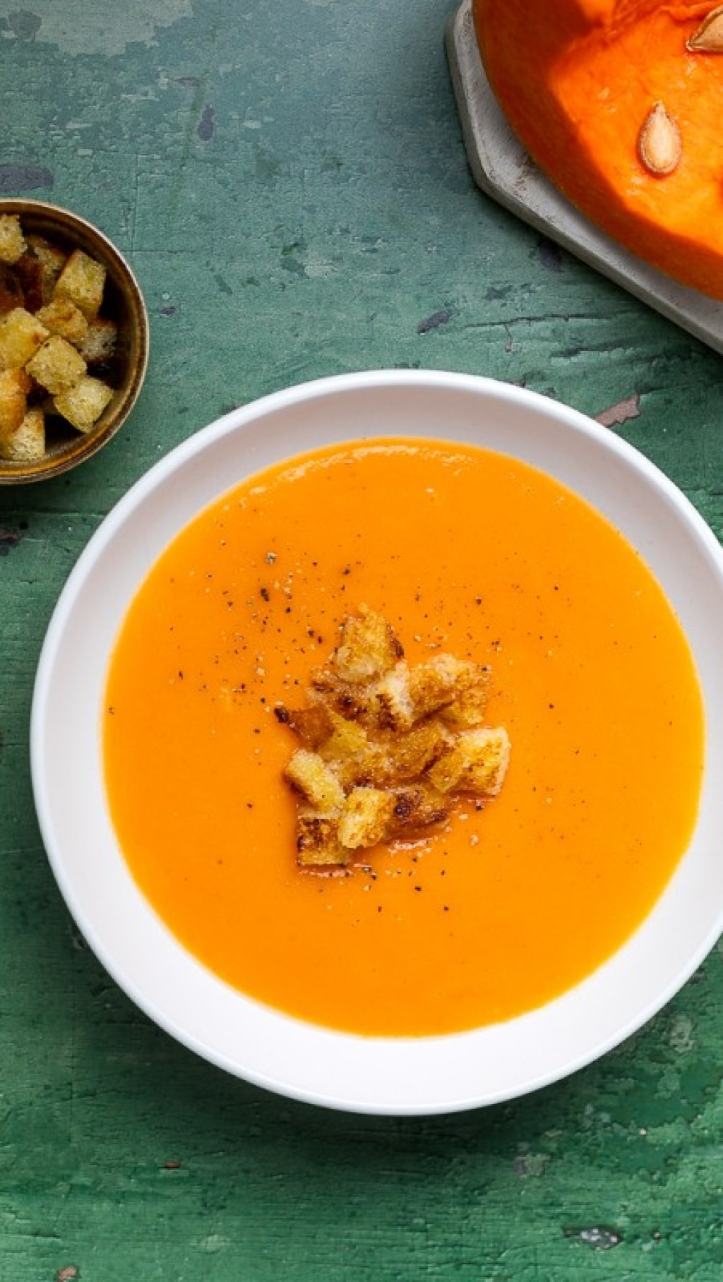 Trasferite la crema di zucca nei piatti da portata e servite con un filo d'extravergine a crudo, una macinata di pepe se gradito e crostini di pane dorato.