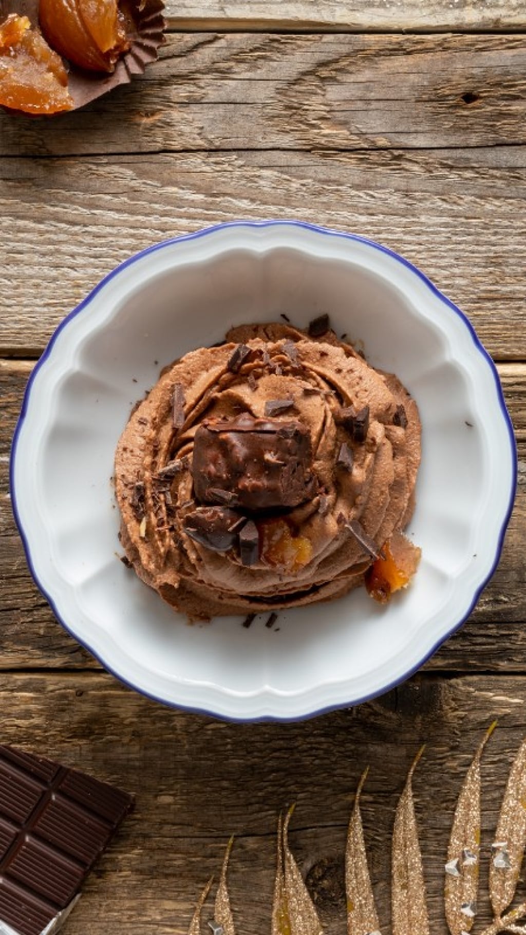Una mousse da servire al bicchiere che guarnita con praline miste o marron glacé sbriciolati diventa un dessert elegante per una cena speciale. La crema al mascarpone e cioccolato senza uova è perfetta anche per farcire e ricoprire torte a strati o decorare golosi cupcakes.