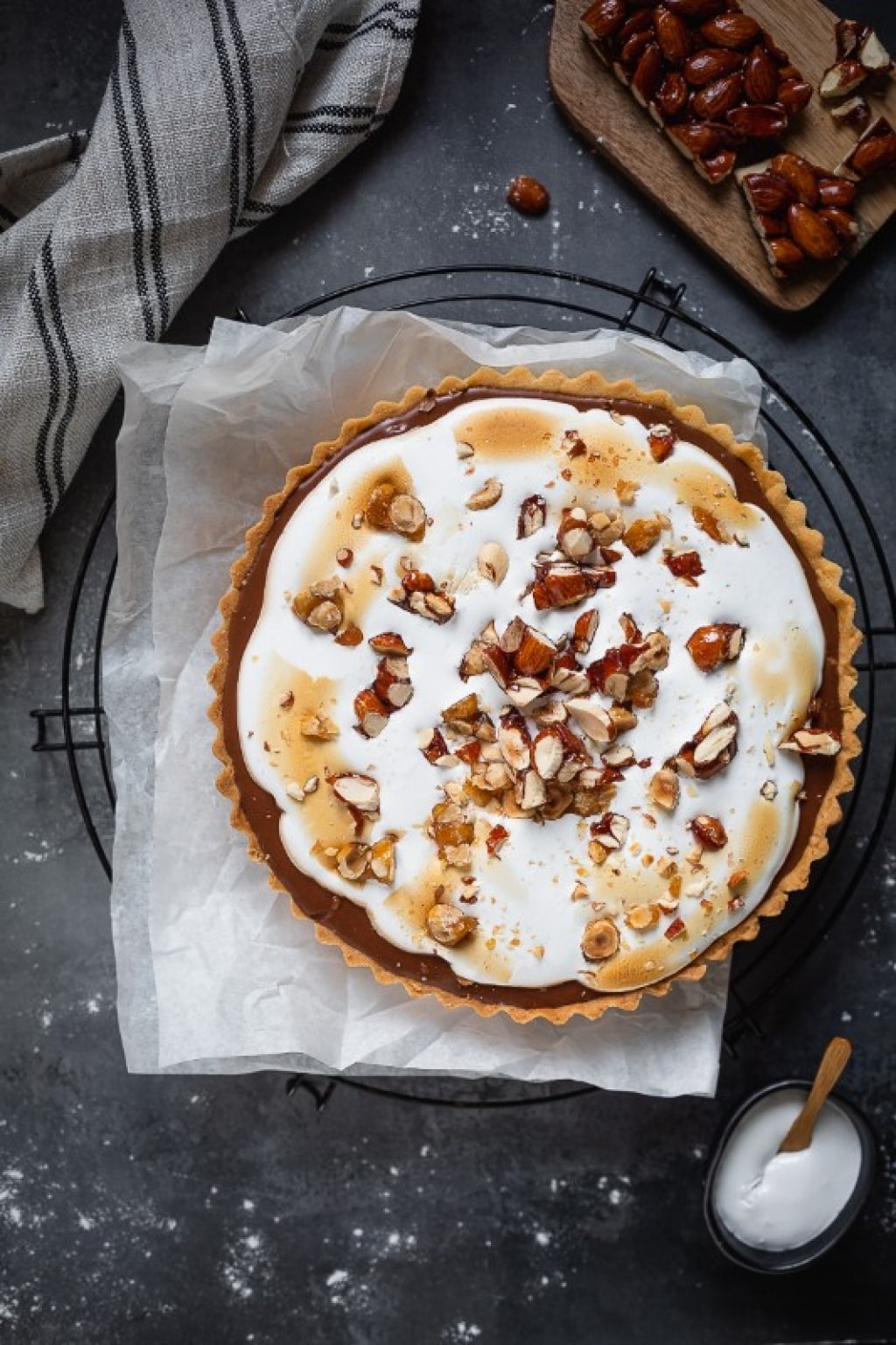 La crostata con mousse al cioccolato fondente, meringa e croccante è una dessert con una base di pasta frolla farcita con una sinuosa mousse al cioccolato. Una ricetta natalizia decorata con abbondante meringa e pezzetti di croccante. Una torta semplicemente wow!