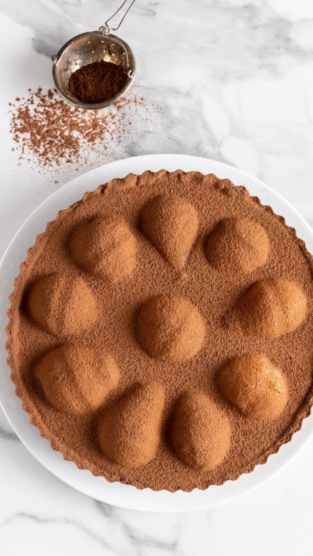 Adagiatevi sopra le pere sciroppate tagliate a metà dopo averle fatte ben sgocciolare. Versate quindi la ganache rimasta in modo che le pere ne risultino quasi completamente coperte e si intravedano solo leggere ‘curvature’ sulla superficie della torta. Lasciate riposare in frigorifero per una notte. Al momento di servire, spolverate la crostata con del cacao in polvere con un setaccio.