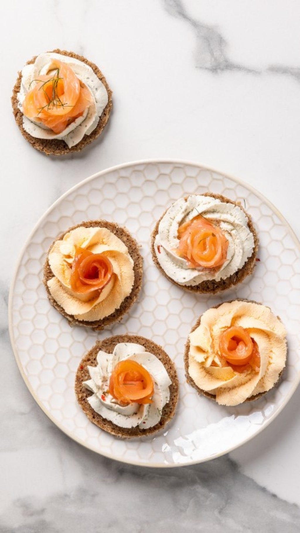 Disponete il formaggio spalmabile sui crostini di pane nero tiepidi. Arrotolate le fettine di salmone affumicato e adagiatele sul formaggio.
