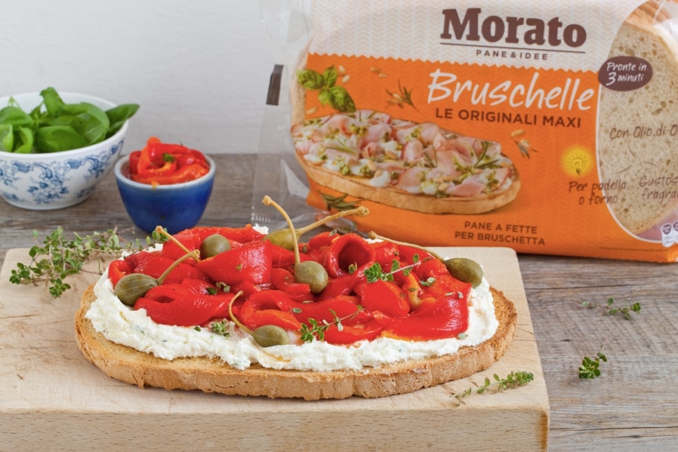 Fate tostare su una griglia calda la Bruschella. Distribuite il formaggio di capra, i peperoni, i fiori di cappero e completate con un po’ d’olio a crudo. Servite subito.