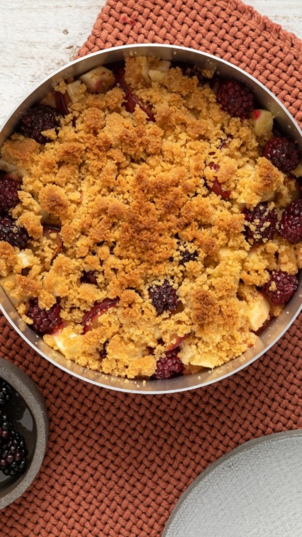 Il crumble di prugne, mele e more è un goloso dessert dal delizioso contrasto fra la morbidezza della frutta, dalla nota acidula, e la dolcezza della copertura.