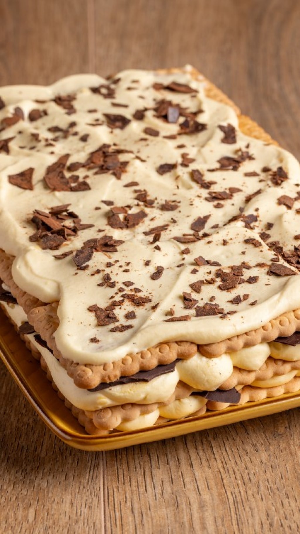 Create un secondo strato di biscotti, aggiungete sopra la crema e qualche altra sfoglia di cioccolato. Utilizzate gli ingredienti rimasti per il terzo e ultimo strato, iniziando dai biscotti e terminando con la crema diplomatica.
