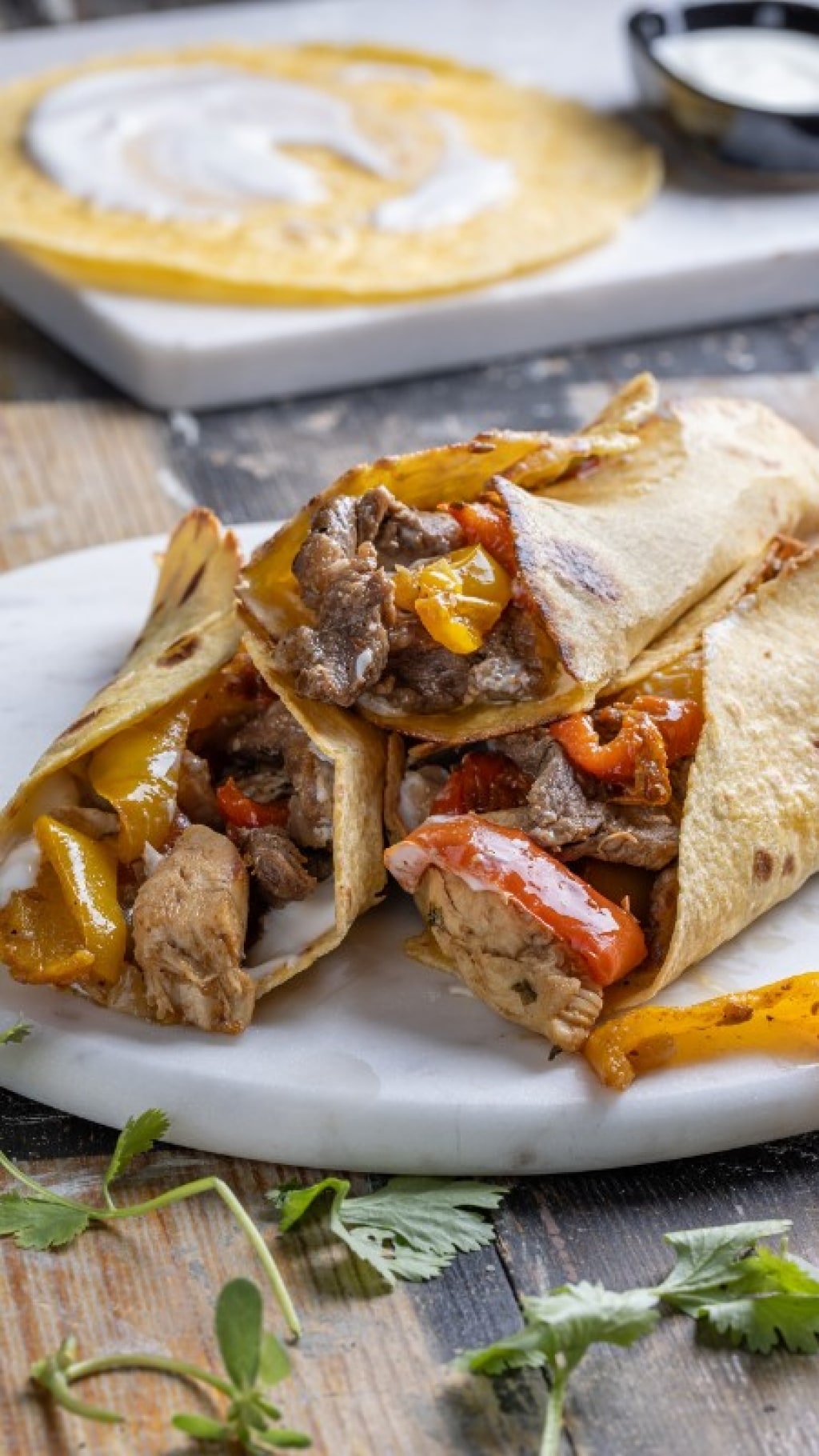 Tortillas di mais bianco, o di farina di frumento, ripiene di striscioline di carne speziate e cotte in padella con i peperoni. Sono buonissime, sfiziose e divertenti anche perché si gustano mangiandole con le mani: sono quindi l'idea perfetta per una cena tra amici.