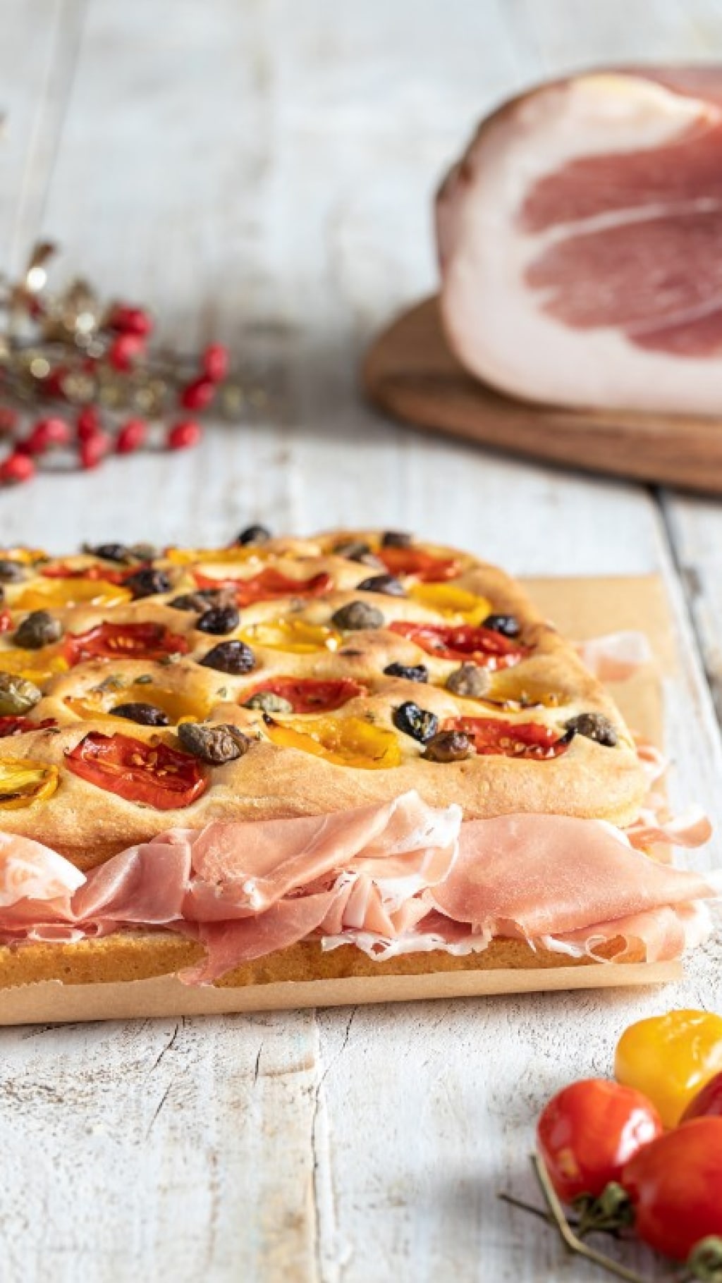 La ricetta è un viaggio tra alcune eccellenze gastronomiche che vanno dal sud al nord del Paese. I sapidi capperi di Pantelleria, i pomodorini del piennolo del Vesuvio, così chiamati perché conservati appesi a un filo durante buona parte dell'inverno e le olive taggiasche dal lieve retrogusto amarognolo. A completare la ricetta il prosciutto di San Daniele, eccellenza italiana apprezzata in tutto il mondo, che trasforma la focaccia in un esclusivo piatto unico. Tagliata a quadrotti è perfetta per l'aperitivo o una merenda ricca e sostanziosa.