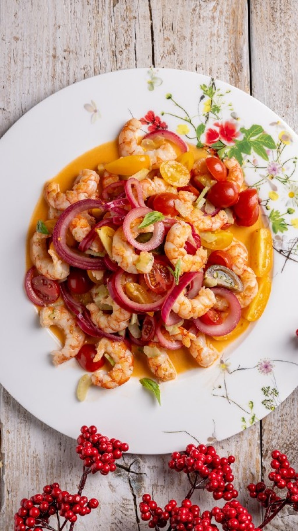 In una ciotola assemblate sedano e pomodorini, aggiungete la cipolla marinata - ben scolata, sciacquata e asciugata - e i gamberi scottati. Condite il tutto con un dressing di citronette ben emulsionata (in alternativa con succo di limone, olio, sale) e guarnite con qualche foglia di basilico. Ecco pronti i gamberi alla catalana.
