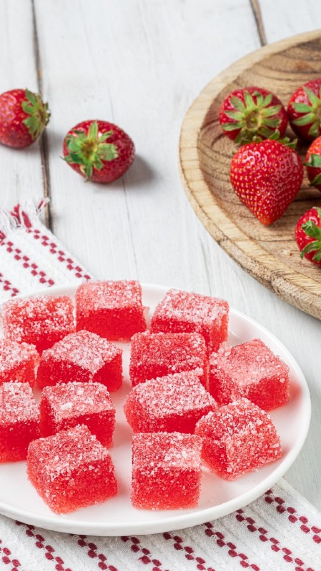 Passate le gelatine di fragole nello zucchero semolato in modo da ricoprirle completamente e servite.