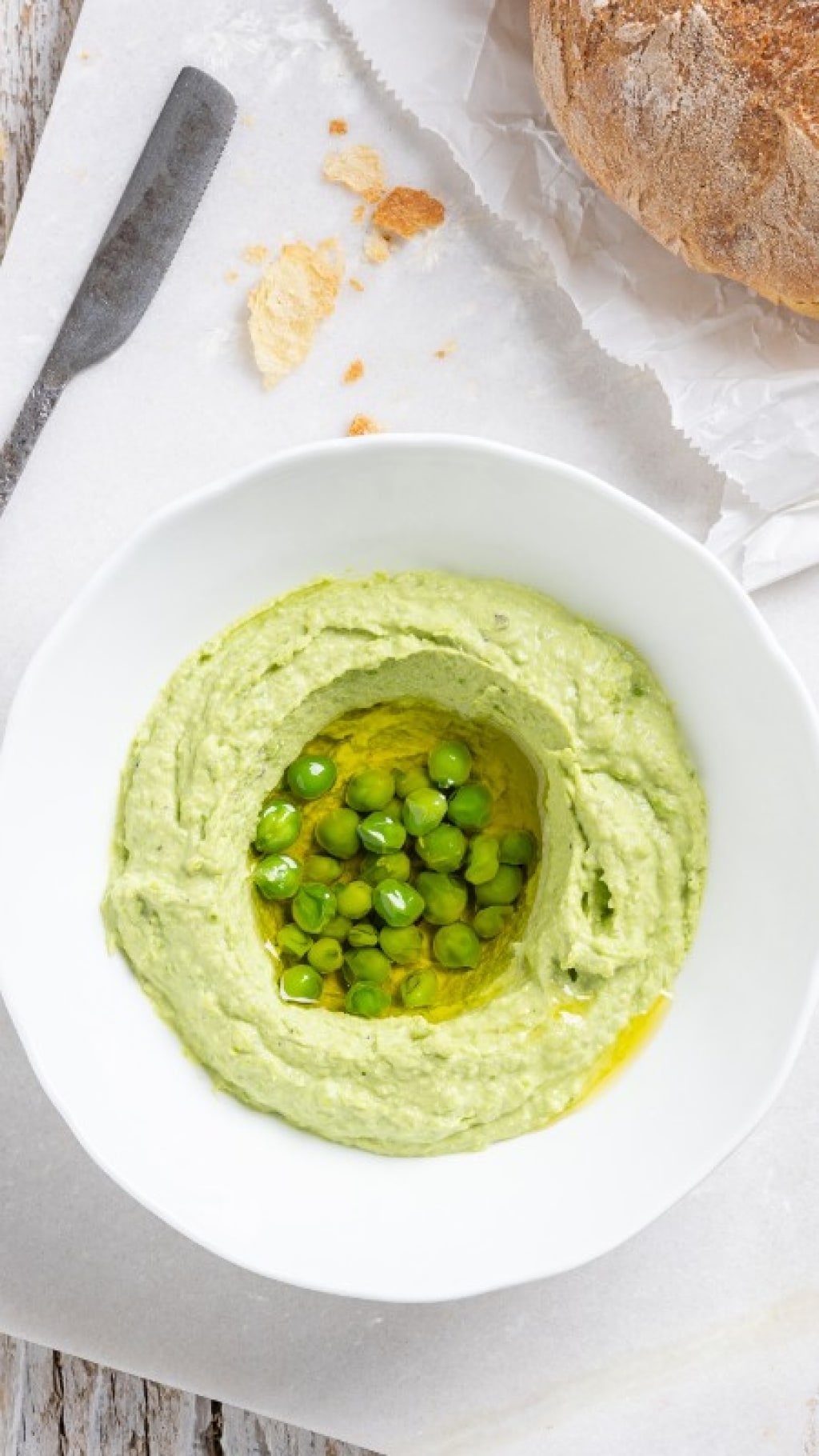 Completate l'hummus di piselli con un giro d'olio e con dei piselli sbollentati tenuti da parte. Servitelo a tavola con delle fette di pane come accompagnamento.